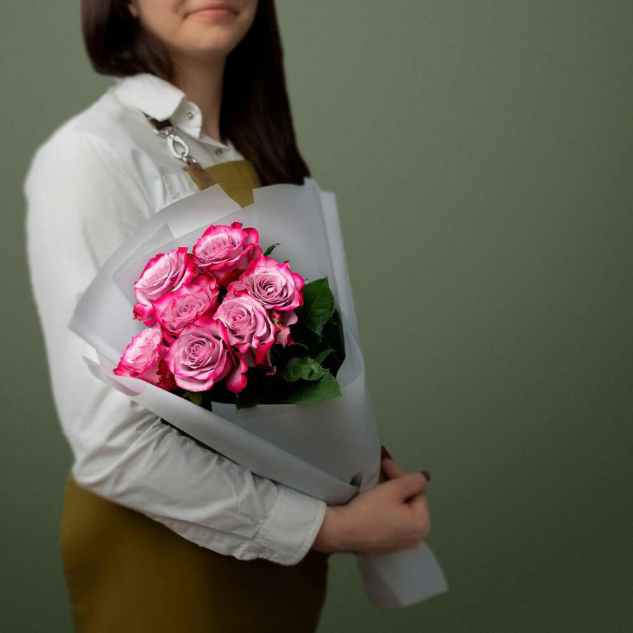На фото букет из 7 фиолетовых роз. В составе: роза 7 шт, дизайнерская упаковка 1 шт, атласная лента 1 шт, . Все цветы свежие и ароматные, букет красиво оформлен и отлично подходит для подарка. Доступна доставка цветов или самовывоз.