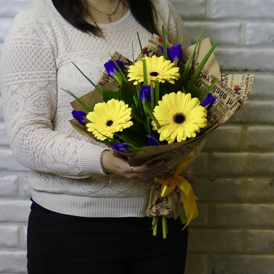 Букет из желтых гербер с синими ирисами в Архангельске