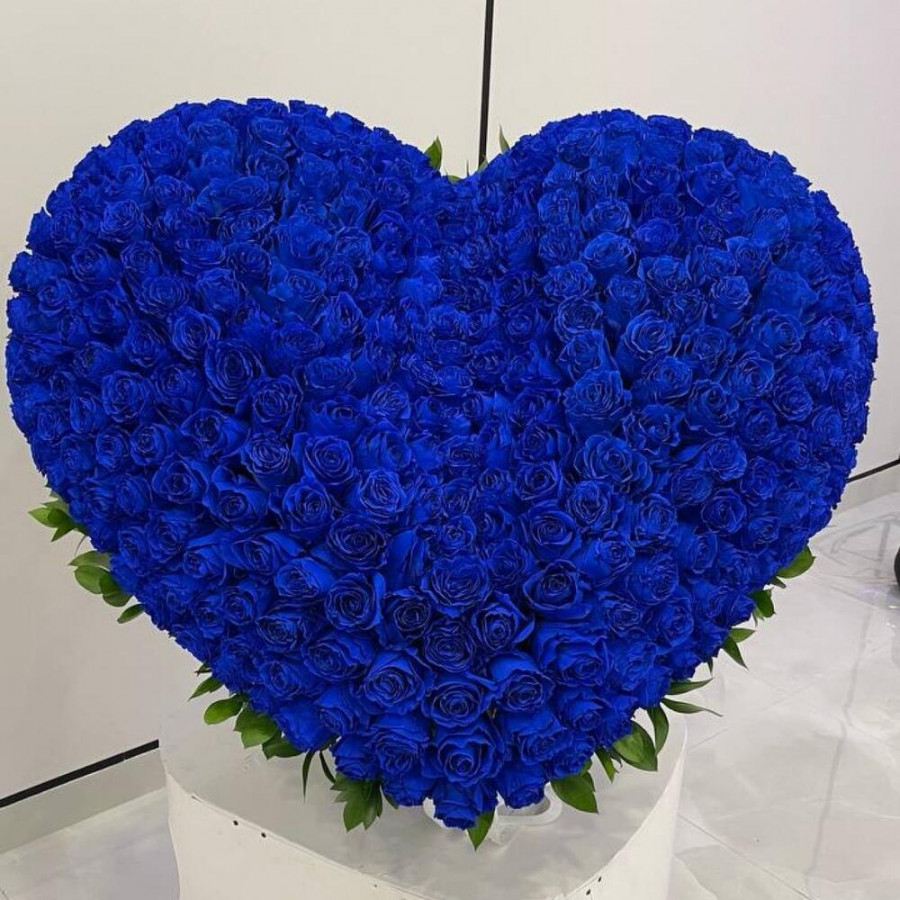 Эффектная композиция в форме сердца из 351 насыщенно-синей розы. Размер ~70×70 см. Сильный вау-эффект для признаний и особых дат.
